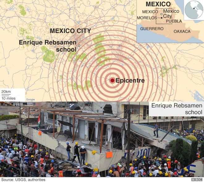 Waokoaji katika mji wa Mexico city wanajaribu kumfikia msichana mdogo, aliye hai chini ya kifusi cha jengo la shule, lililoporomoka wakati wa Tetemeko la ardhi lililotokea jana.
