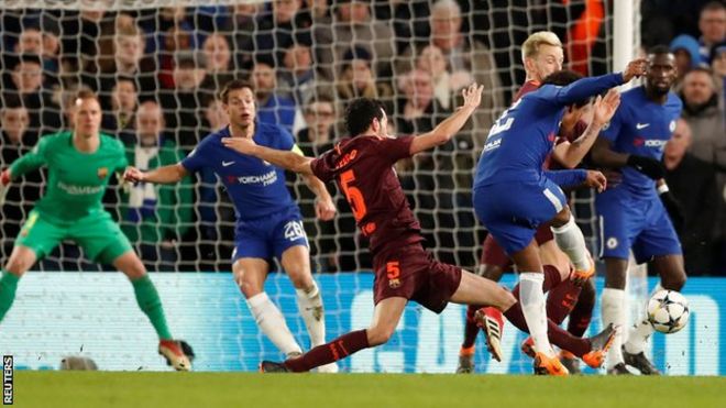 Klabu za Chelsea na Barcelona zimemetoka sare ya 1-1 katika mchezo wa kwanza wa raundi ya 16 katika michuano Ligi ya Klabu Bingwa Ulaya UEFA.